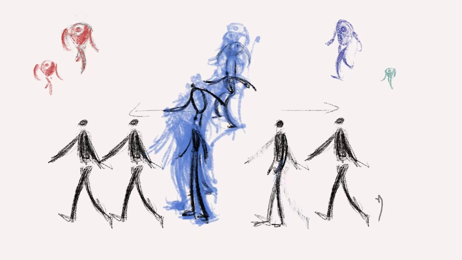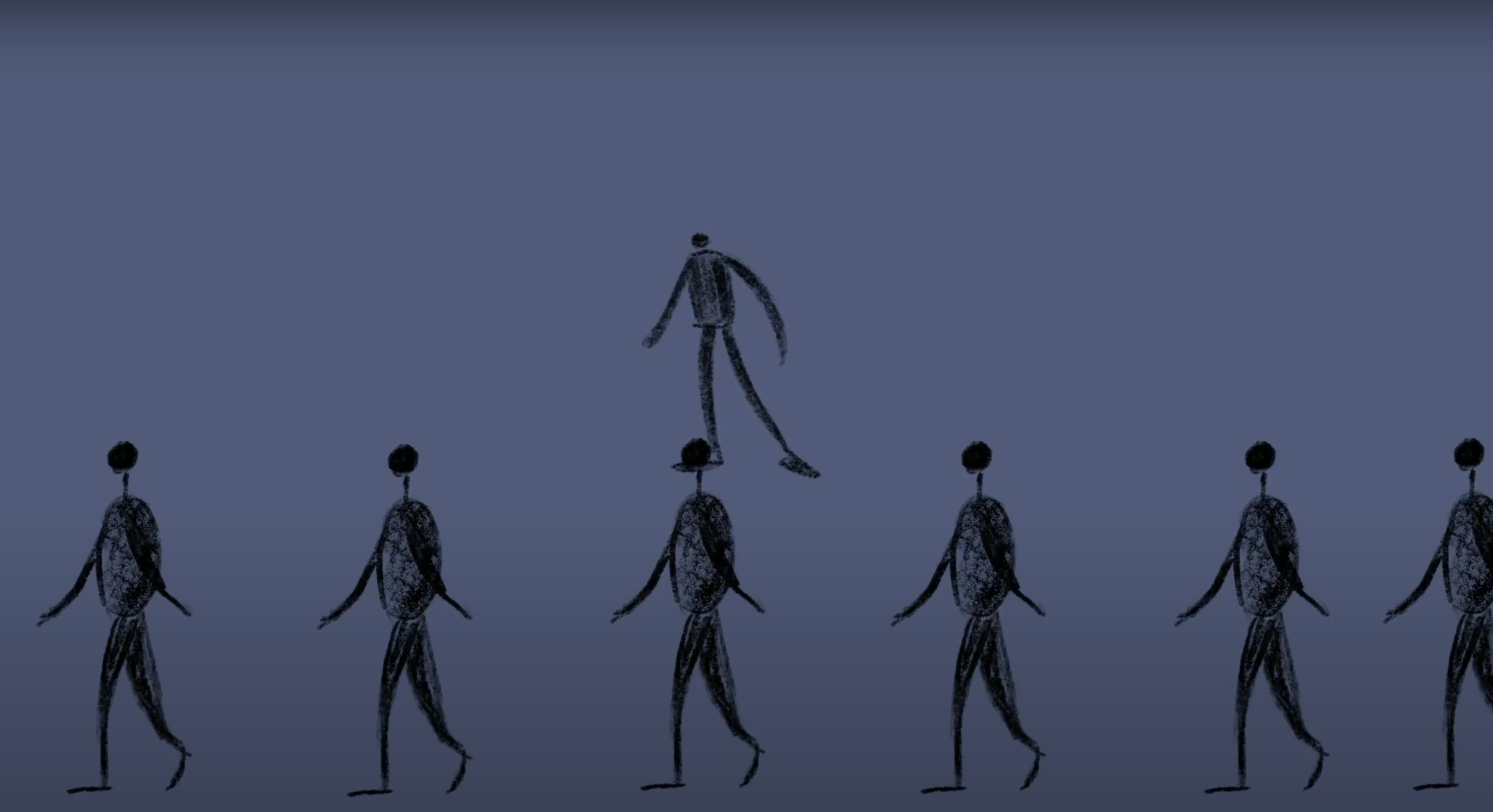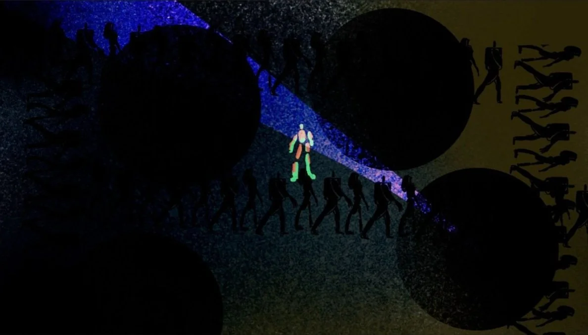 以动画的形式从孩子的视角出发,阐述了不同阶段孩子的变化。两个人脸面对面窃窃私语 展现出周围人对一个孩子从小到大不同的期待与教诲。第二个场景,小人犹犹豫豫前进插进一个队伍中 展现出孩子慢慢融入了所谓的“群体”变得逐渐失去自我,盲目跟从。第三个场景,两双大手不停的揉捏孩子使得最终变成一个方方正正的方块,周围人的期待与教育方式是为了让孩子变成贴合社会的方块。第二个场景2,触手小人一开始舞动着颜色绚烂的触手代表着一开始孩子的想法是多姿多彩天马行空 充满想象力与活力的, 渐渐的触手小人身上的彩色触手开始脱落 颜色暗淡下去 代表着孩子最终选择放弃自己的想法。